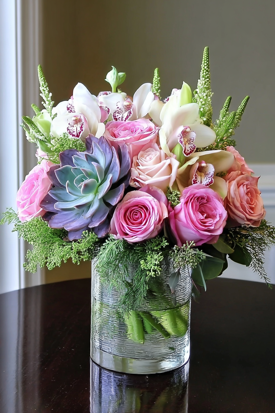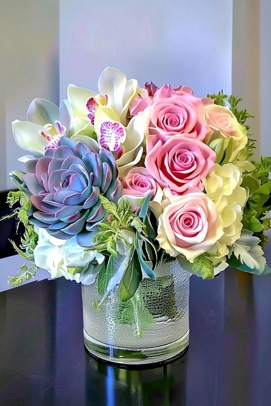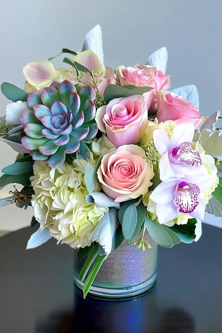 With the addition of hydrangeas and orchids, this mercury blend achieves an air of sophistication. Hydrangeas offer fullness and depth, while orchids contribute elegance and a unique flair, ensuring your floral display is nothing short of spectacular.