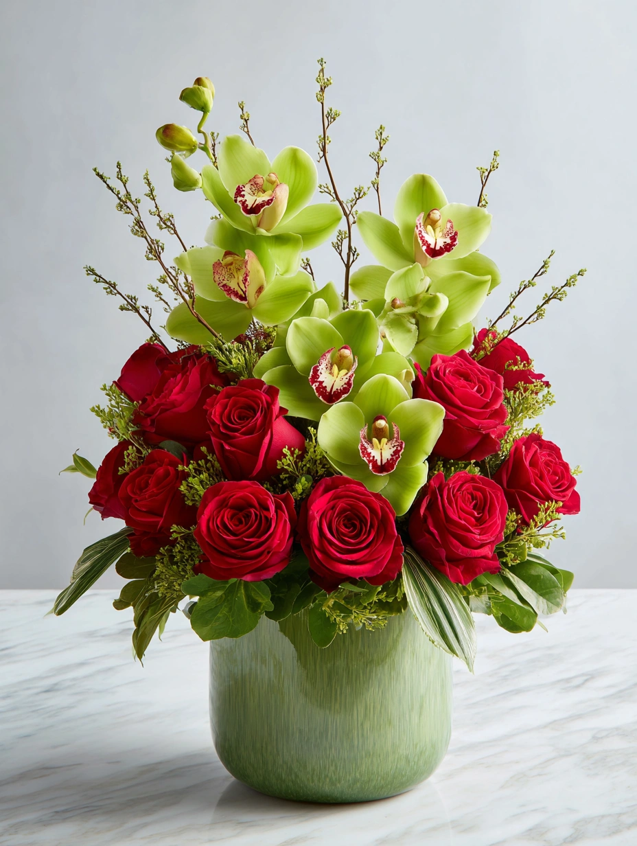 Indulge in the timeless beauty of our Red Roses and Green Orchids arrangement. Celebrated for their vibrant color and alluring scent, red roses are the epitome of romance and passion. Whether it’s a special occasion or a heartfelt gesture, these exquisite blooms are sure to leave a lasting impression. Each rose is carefully selected for its rich hue and velvety petals, ensuring that your floral gift stands out as a symbol of love and affection.